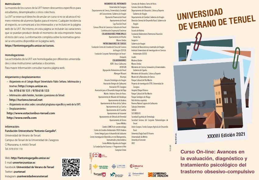Entre el 30 de junio y el 2 de julio de 2021 se celebrará el curso on line “Avances en la evaluación, diagnóstico y tratamiento psicológico del trastorno obsesivo-compulsivo” dentro del programa de cursos de la Universidad de Verano de Teruel en su XXXVII edición. El curso está dirigido por D. Jorge Osma, profesor titular de la Universidad de Zaragoza y cuenta con grandes profesionales del TOC. Una cita indispensable para los especialistas en salud mental.