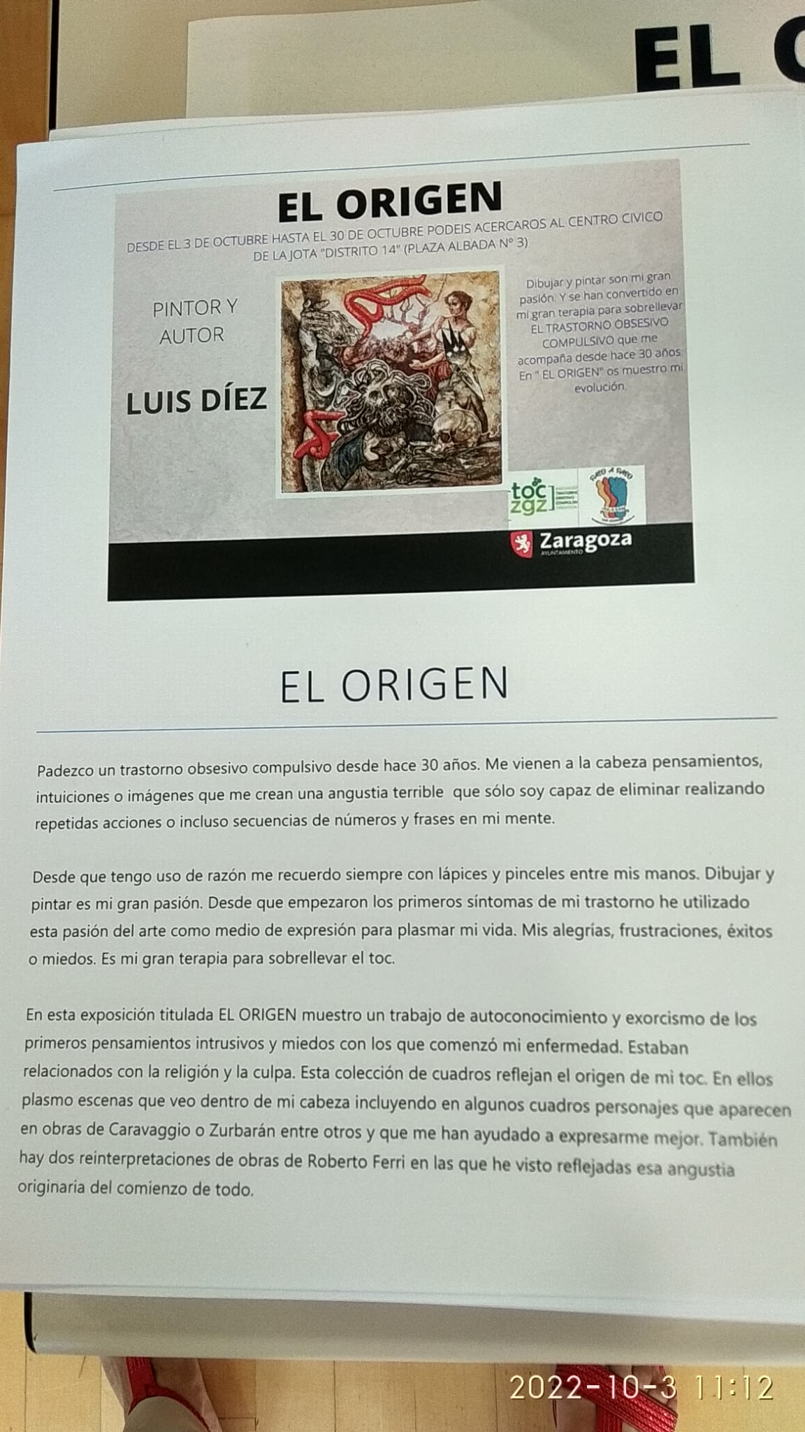 Otro evento de gran importancia ha sido la exposición de pintura de nuestro socio Luis Díez, un gran pintor que, en sus propias palabras “utiliza la pintura como terapia”. “Cuando pinto, el TOC desaparece”, nos ha comentado más de una vez. Realmente sus pinturas son las de un gran maestro. Inspiradas en Zurbarán, Caravaggio y Roberto Ferri, pero con un sello y un estilo propios, muy sugeridor, impactante.