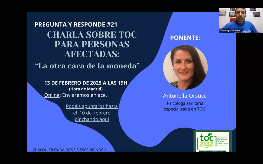 Agradecemos a las profesoras y a sus respectivos centros educativos su invitación y buena acogida. Con ello están colaborando a que se conozca el TOC y, de esta manera, ayudar a los jóvenes que padezcan este trastorno y a sus familias, ya que la detección temprana es decisiva para su recuperación. Y, cómo no, les damos las gracias a nuestros compañeros, María Jesús y Yann por su impagable labor y buen hacer en la difusión del TOC.