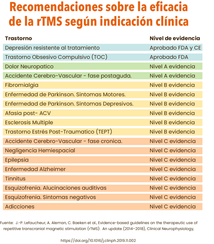 - LEFAUCHEUR, J-P., et al., 2020. Evidence-based guidelines on the therapeutic use of repetitive transcranial magnetic stimulation (rTMS): An update (2014–2018). Clinical Neurophysiology. Vol. 131, pp. 474–528. DOI: https://doi.org/10.1016/j.clinph.2019.11.00217.