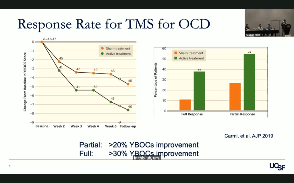 Aproximadamente un poco más de la mitad de los pacientes se benefician del tratamiento con EMT para el TOC. Algunos notarán un efecto después de relativamente pocas sesiones, pero otros solo lo notarán más adelante. Algunos pacientes pueden beneficiarse de tratamientos de mantenimiento continuos para ayudar a prevenir la reaparición de los síntomas.3,7