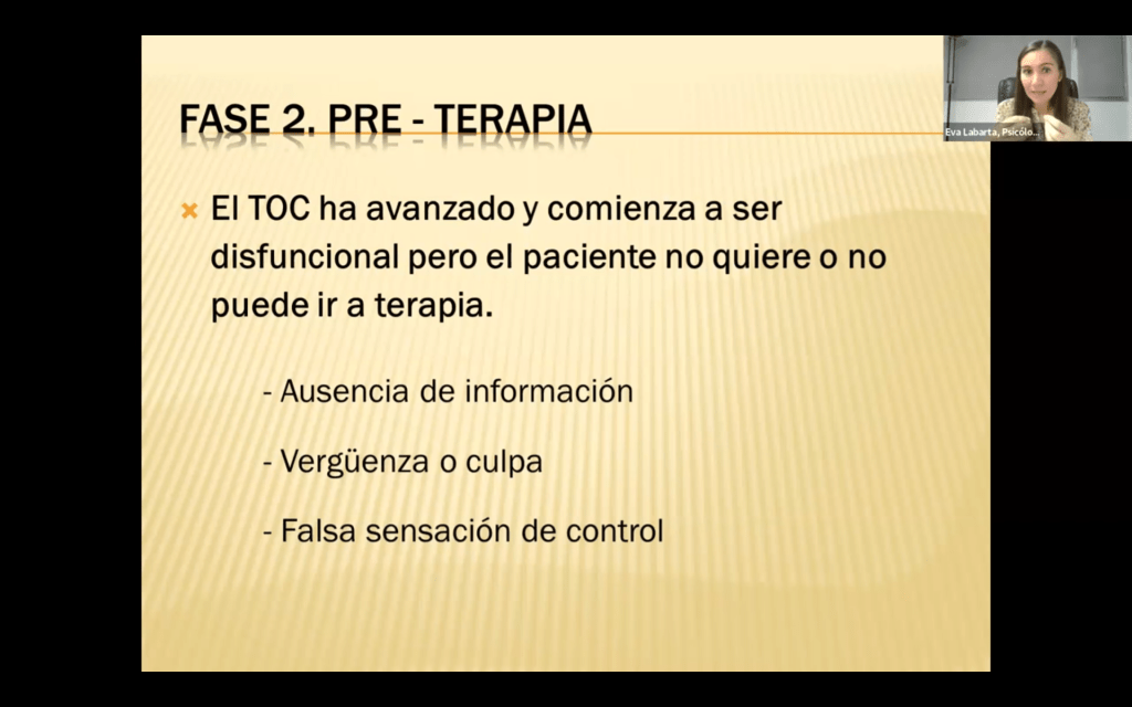 En esta ocasión fueron impartidas por la psicóloga sanitaria, experta en Trastorno Obsesivo Compulsivo, Eva Labarta, la cual ejerce como psicóloga especialista en TOC en su gabinete de Logroño, tras haber trabajado como psicóloga titular en la asociación y centro sanitario TOC Granada, durante varios años. Las dos sesiones se llevaron a cabo en la modalidad on line y en cada una de ellas participaron veinte asistentes quienes pudieron formular sus dudas y preguntas a la psicóloga, tras la presentación que hizo ella acerca del TOC y posteriormente dar respuesta a las cuestiones que se habían formulado previamente por correo electrónico.